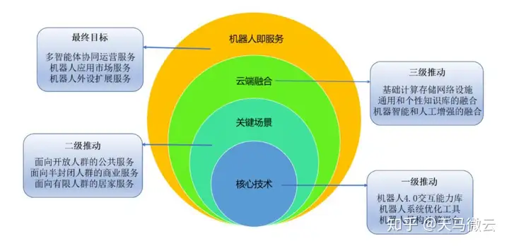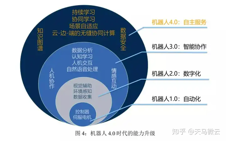 通过关键技术的不断迭代,提升云机器人的智能化、信息化水平,使云机器人接近认知智能层级。不断增强机器人的拟人化和交互沟通能力,学会推理决策,最终实现人机共融,扩大应用范围是未来重要的发展趋势。总体来看在第四次工业革命浪潮的推动下,人机共融将成为新一代机器人的发力点,也是世界机器人领域研发创新的主要方向。