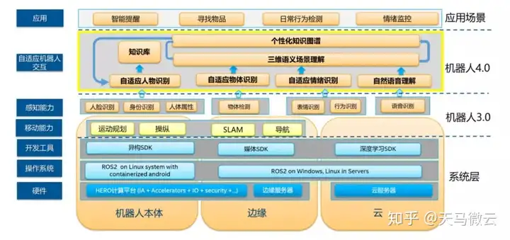 传统机器人在执行即时定位和地图构建、物品抓取、定位导航等复杂任务时,大量数据的获取和处理会给机器人本身带来巨大的储存和计算压力,即使能够完成任务,实时性也并不理想。云机器人借助于5G网络,云计算与人工智能技术,达到了 感知智能层级 。