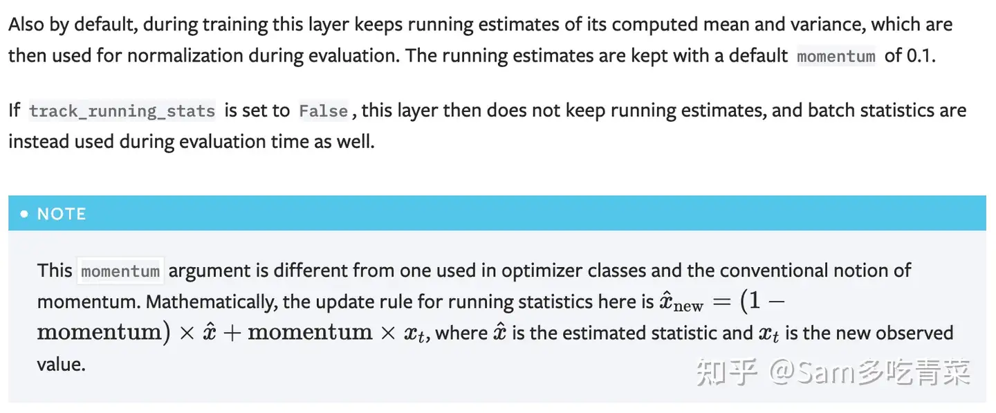 考虑到这两个要求,是不是想起了SGD里的momentum?采用训练时指数滑动平均的方式就可以得到测试时用的统计量,参考torch的官方文档: